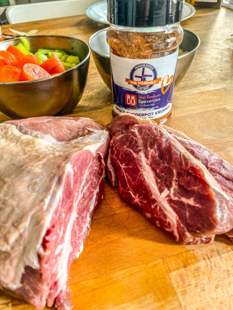 Ok, in principe maakt het echt niet uit of je nu runderlappen of sukkade lappen gebruikt hiervoor. beide soorten zijn bedoeld om heerlijke stoofgerechten te maken zoals hachee, vlaamse stoof of een heerlijke irish stew. Ik heb hier gekozen voor sukkade lappen omdat ik het lekkerder vind vanwege de structuur en ook de wat zoetige smaak die het heeft na uren lang sudderen. Je leest het goed, het is dus een persoonlijke keuze. Maar wat is nu het verschil? Sukade lappen en runderlappen zijn beide stukken rundvlees, maar ze verschillen in textuur en bereiding. Sukade lappen komen van de schouder van het rund en bevatten een kenmerkende zeen (bindweefsel) die bij langzaam stoven verandert in gelatine, waardoor het vlees extra mals en sappig wordt. Runderlappen daarentegen zijn een bredere categorie en kunnen van verschillende delen van het rund komen, zoals de bil of schouder. Ze bevatten minder bindweefsel en kunnen iets steviger blijven na bereiding. Beide soorten vlees zijn ideaal om te stoven, maar sukade lappen hebben vaak een zachtere en smeuïgere structuur.