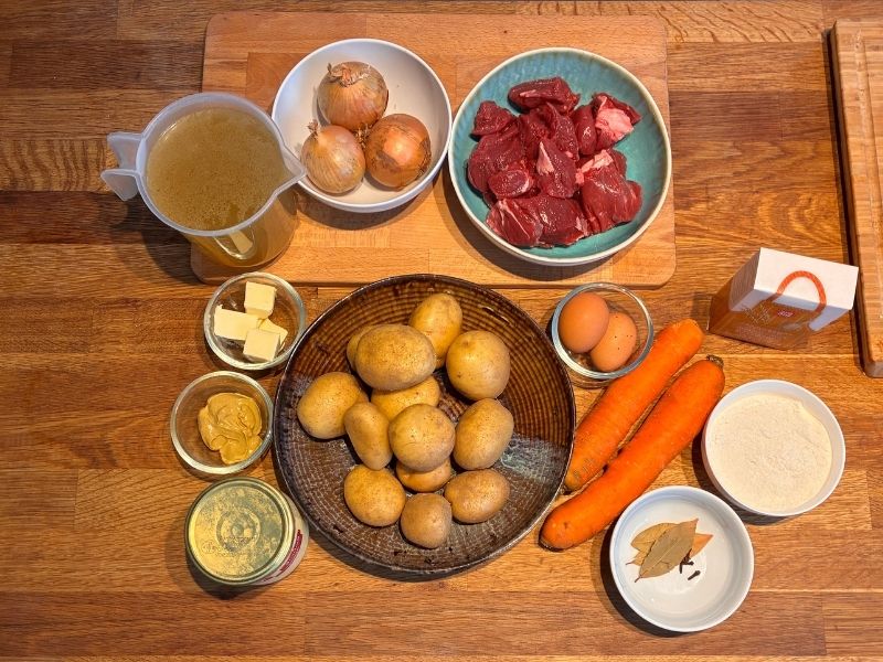 - Jus-dip maken: Smelt boter, voeg bloem toe en laat even garen. Voeg het vocht van de stoof en wat extra water (100ml max) en mosterd toe, roer tot een gladde saus. Breng op smaak met peper en zout.