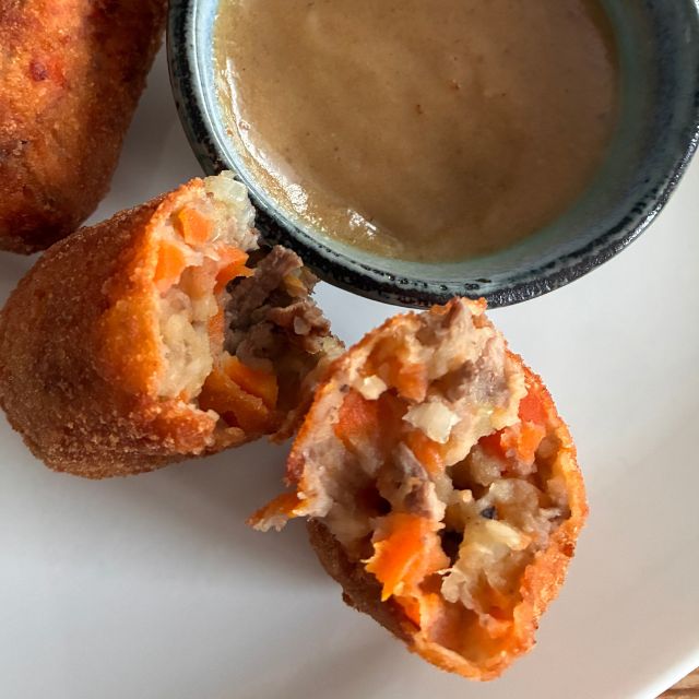 De vulling is een mengsel van grove hutspotpuree en langzaam gegaard draadjesvlees. Je maakt ‘m op voorhand en rolt er stevige kroketten van. Paneren, frituren, klaar. De buitenkant is knapperig goudbruin, de binnenkant zacht, hartig en herkenbaar. Alles wat je wil in een Hollandse snack, maar dan met een verhaal.